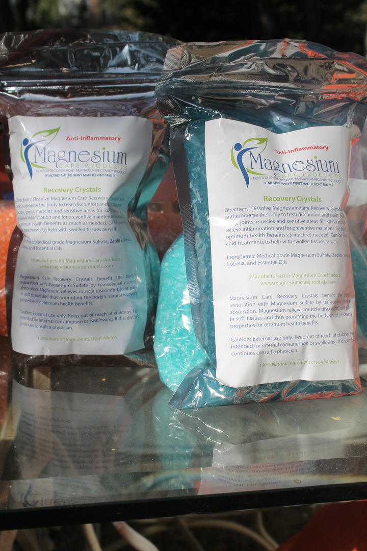 We provide Magnesium transdermally (thru the skin) for absorption in the Recovery Spray, Recovery Crystals, Recovery Gel, and Recovery Cream, because when Magnesium is taken orally, it acts as a laxative (Milk of Magnesia), thus more Magnesium can be absorbed and utilizied in the body transdermally via your largest organ, you skin.